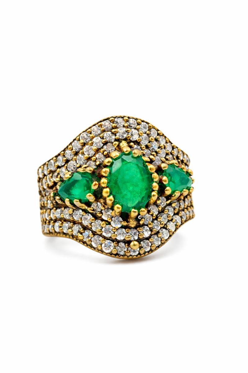 925 Sterling Silver And Brass Ring In The Turkish Ottoman Style With Green Emerald And Cz Stones
